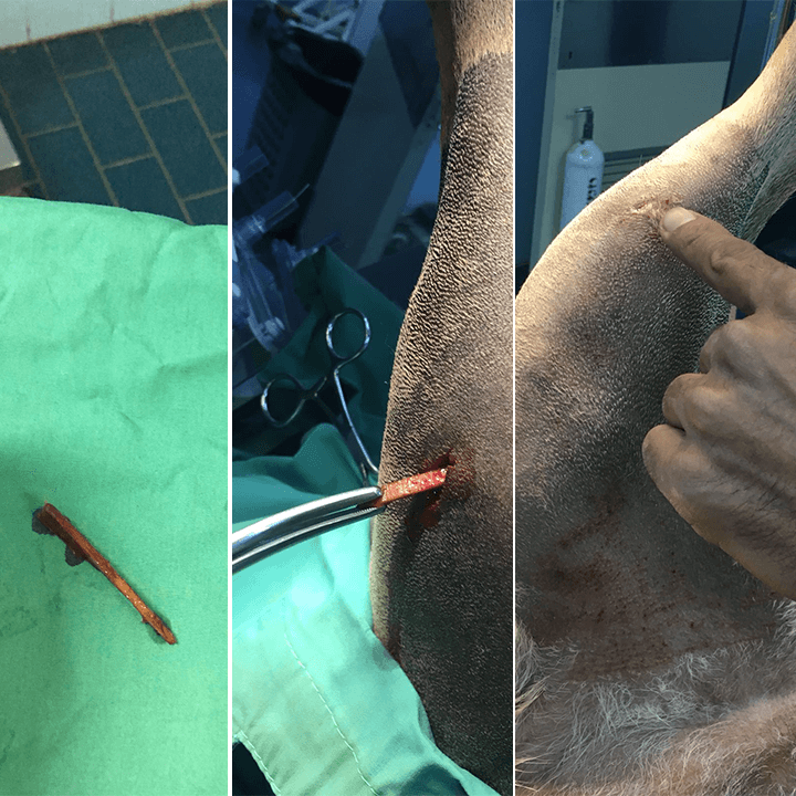 מקרה קליני מהמרפאה: השבוע הגיע למרפאתנו הכלבלב ג' לאחר שבמהלך משחק נכנס לרגלו מקל של שיפוד. הבעלים ניסו לשלוף את המקל אך המקל נשבר בתוך הרגל, כתוצאה מכך נשארה חתיכת עץ שגרמה לכאב ונפיחות באזור. לשמחתנו הצלחנו בניתוח להוציא בשלמות את החתיכה שנותרה. חשוב לציין כי לא מומלץ לשלוף לבד דברים שנתקעו בגוף אלא לפנות מיד לוטרינר. שליפה עצמאית יכולה לגרום לנזק בלתי הפיך כתוצאה מהשליפה.